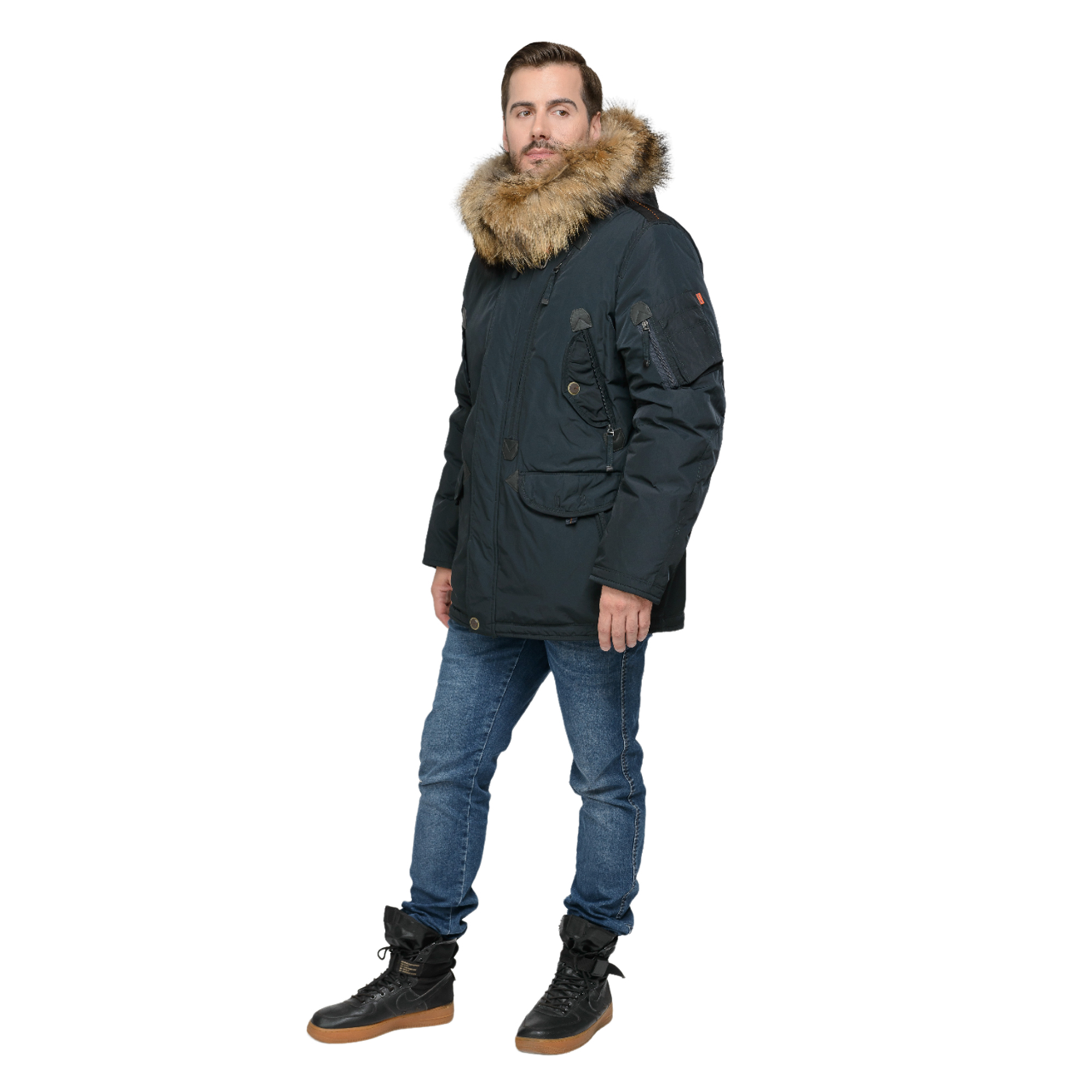 - Объёмный капюшон с отстёгивающейся опушкой из натурального меха